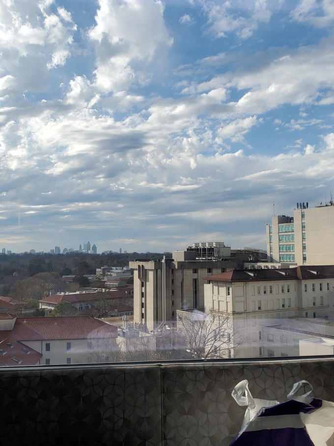 I sit in the hospital bed, I must sleep mostly sitting up as I am unable to lay flat due to the abdomen incision. I await the discharge day and speak to my husband by phone. My view isn’t anything to brag about but not horrible either.